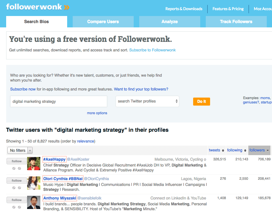 Followerwonk is often mentioned as a free service that can be used to find influencers via their Twitter bio, but this limits it as these examples show. Most marketers I know wouldn't know of the top 3 'influencers' here, instead, they are being rewarded for the use of auto-follow bots.