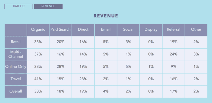 Paid and organic search are also important for retail sales, but referrals from other sites i.e. including affiliate marketing are lower here.