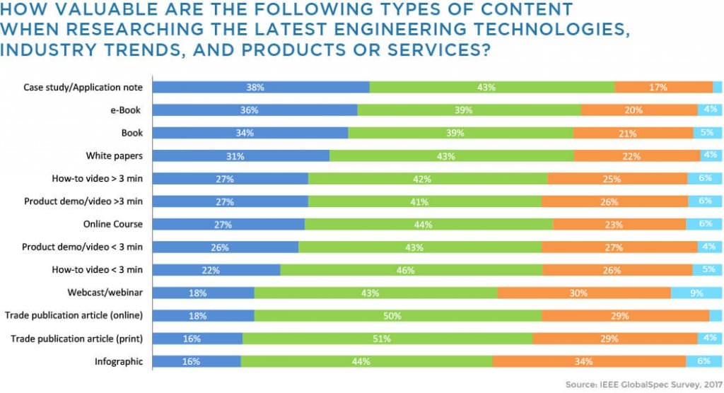 Here case studies and whitepapers are much higher, but webinars are lower than in some sectors (for example marketing).EEE GlobalSpec’s survey of 890 engineering professionals showed case studies to be the highest ranked type of content marketing for value – with 81 percent of respondents ranking them as either very or moderately valuable.