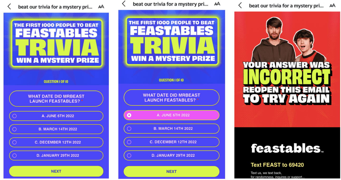 A B2C example of using interactive email to achieve a business end comes from snacks retailer Feastables, which uses AMP for Email in a select group of emails. Below is an example of using the format to draw subscribers into a content built around a trivia quiz.