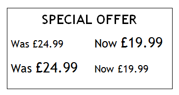 It’s not just the length of the sound of the price that make a difference, though. It is the size of the type you use. This is more straightforward – big type is equated with big prices and small type is perceived as a low price. So if you proudly display your prices in big type because you want to make people aware of your deep discounts, what their subconscious brain sees is something large.
