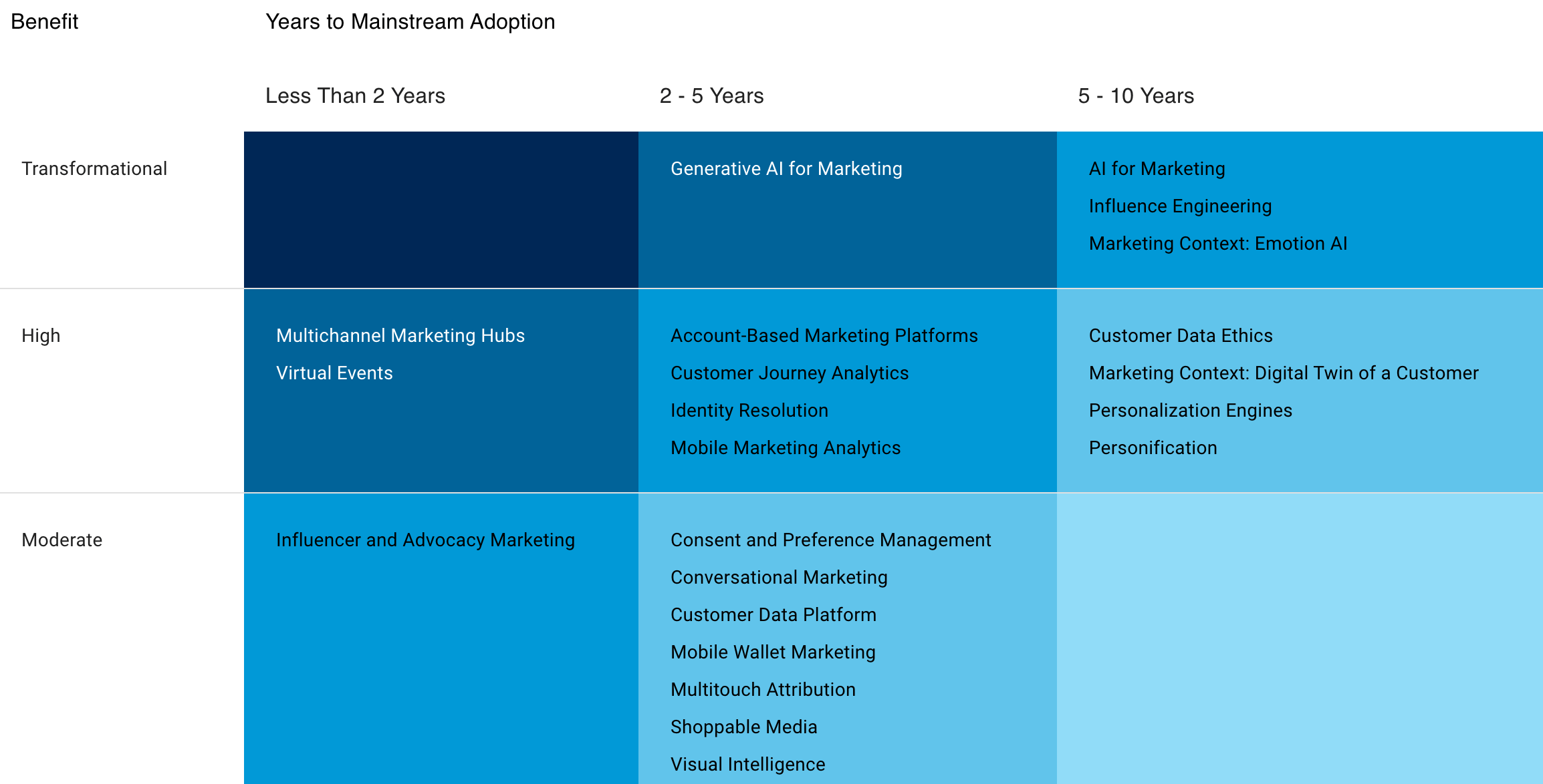 This matrix shows that despite the hype of AI for marketing, mainstream adoption is a long time into the future. For current investment cycles, it's more important to review pans within the next 5 years and in particular the next two years including integrated marketing hubs and influencer marketing.
