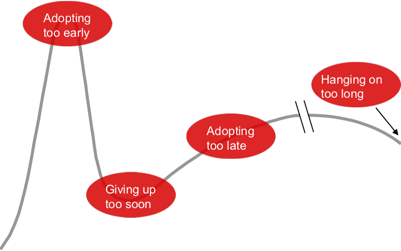 Here is the generic Gartner model of adoption of technology innovations showing adoption at different points in the product lifecycle.