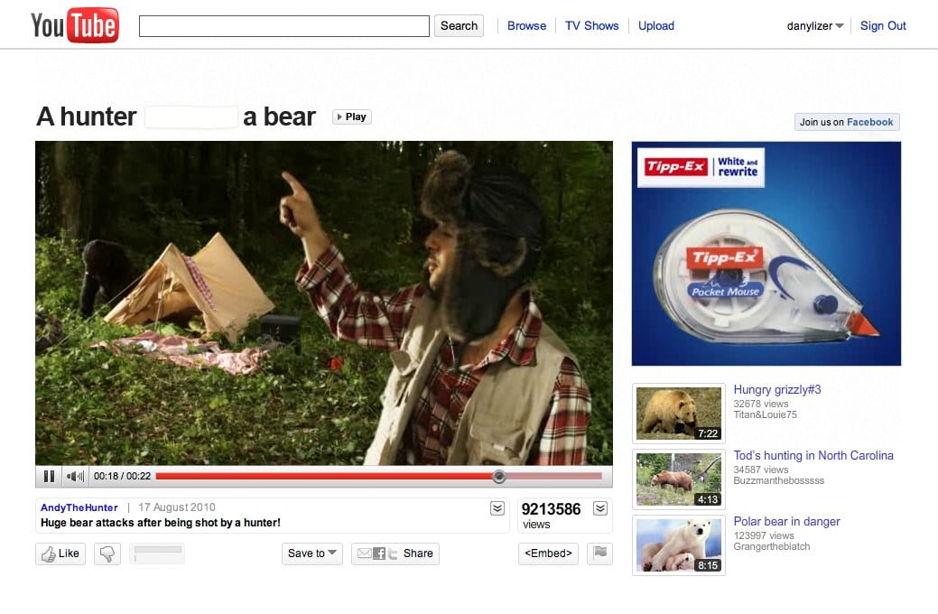 The hunter decides he cannot shoot the bear - instead reaching outside the frame of the video - a cool rich-media tactic - and using the big Tippex dispenser in the ad alongside him to erase "shoots" from the video's YouTube title.