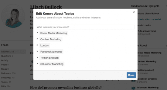 Look for topics with active members and who have lots of followers – this way, you can answer questions posted in that topic and the followers will be able to see your answer in the feeds.