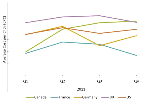 Again it would be good to have specific CPCs, but this data is useful in that it shows there has not been a significant increase in CPC across these markets in 2011 apart from in the US. Indeed UK CPCs have fallen by 10%.