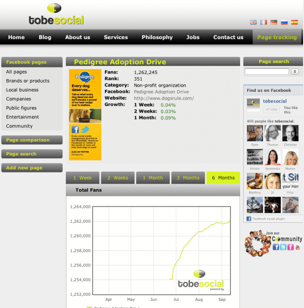We like this simple, free tool which enables you to visualise the growth history of fans of Facebook pages. This example shows how you can see the growth rates of campaigns once registered on the system. Data is extract direct from Facebook Insights using the Facebook API to extract data.
