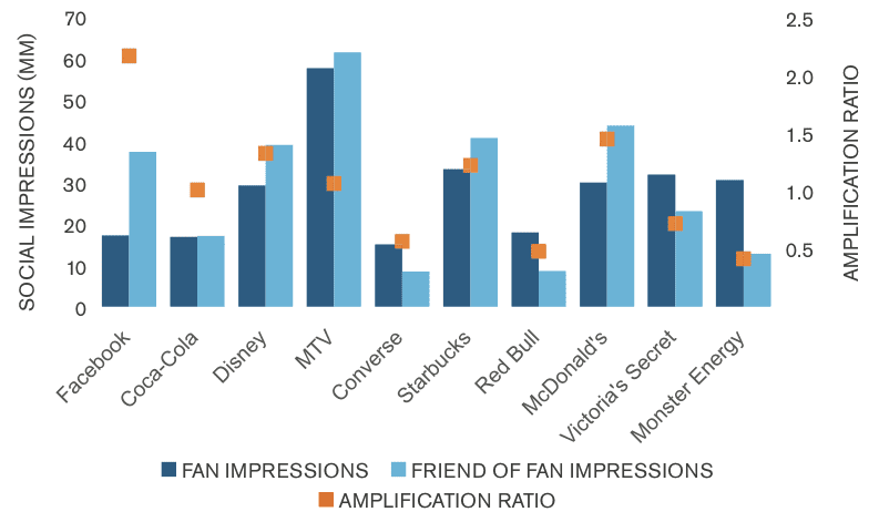 - Amplification is probably more commonly understood in terms of viral marketing (and indeed Facebook Insights generally refers to amplification metrics as viral metrics). The new research shows that for the top ten corporate brands in the US, the average Amplification Ratio average was 1.05 (Range: 0.42 to 2.18). Comscore describes this as "a metric that divides the number of Friends of Fans reached by the number of Fans reached with earned media, or the number of impressions reaching each of these segments".