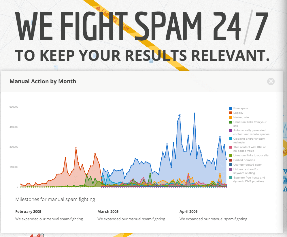 This extract shows the efforts from 2005 to 2012 to manually remove Spam.
