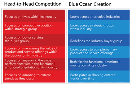 To review opportunities for differentiation, brands need to consider embracing the Blue Ocean strategy which is defined as creating an untapped market place. Created by W. Chan. Kim and Renee Mauborgne, Blue Ocean Strategy suggests an organisation should look to create a new demand in an uncontested market space. The opposite to the Blue Ocean is the Red Ocean, which is where the existing competition is fighting it out for market share with one another as explained below.