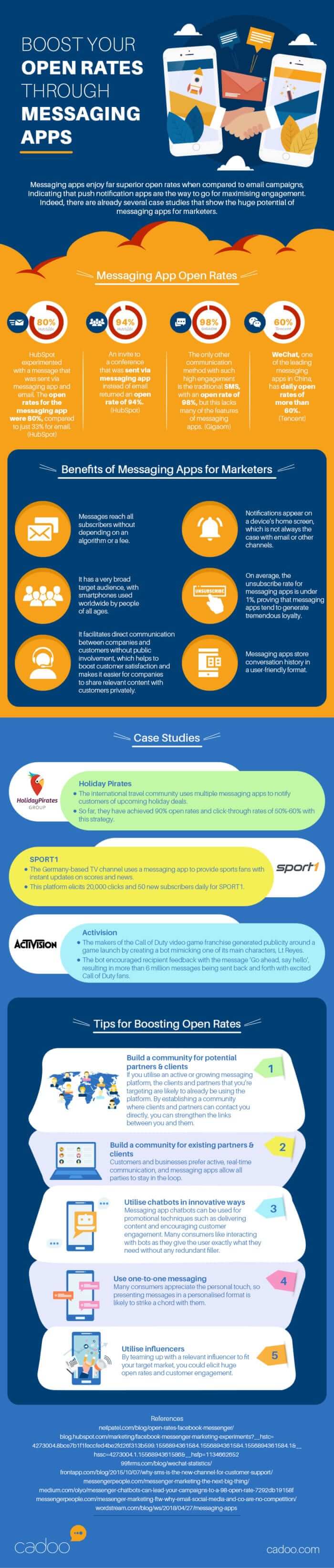 If you are interested in learning more about how messaging apps can help boost your open rates, then you may want to take a look at the infographic below from the team at Cadoo. It takes you through some key stats about messaging app open rates and offers some practical pointers on how to increase the visibility of your messages.