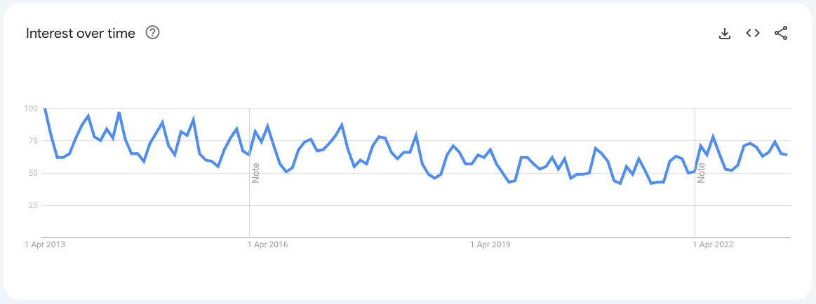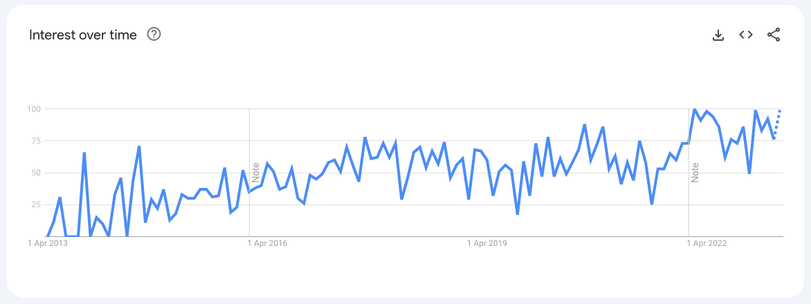 If you're looking for examples to help you structure your new plan, you're not alone. A quick look on Google Trends shows that interest in digital marketing plans has increased steadily in the last 10 years. In fact, when scoring interest over time, 'digital marketing plans' reached highs of 98-100 during February 2022, April 2022, and December 2022 in the US.
