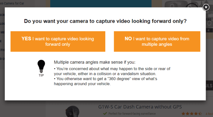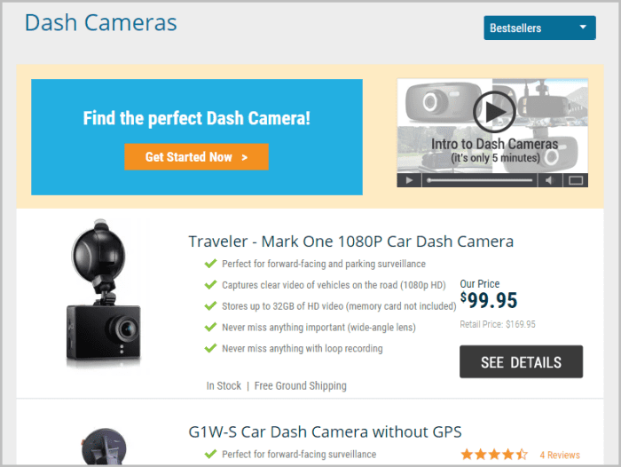 SpyTec, a seller of surveillance products, offers product finders in the main pages for each of its top product categories. Here’s an example of the finder entry point for the ‘dash cameras’ category.