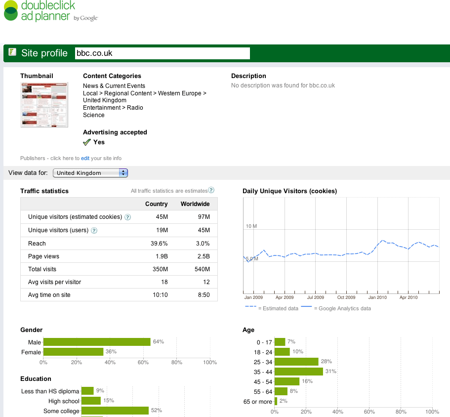 2. Duration or dwell time. The single best source for benchmarking duration is the Doubleclick Adplanner (short cut = www.google.com/adplanner) . For all sites with more than a 1,000 visits a day average time on site is presented, so it's great for comparing to direct competitors with a similar offer. Here we see the BBC has an impressive dwell time of 10 minutes per visit.