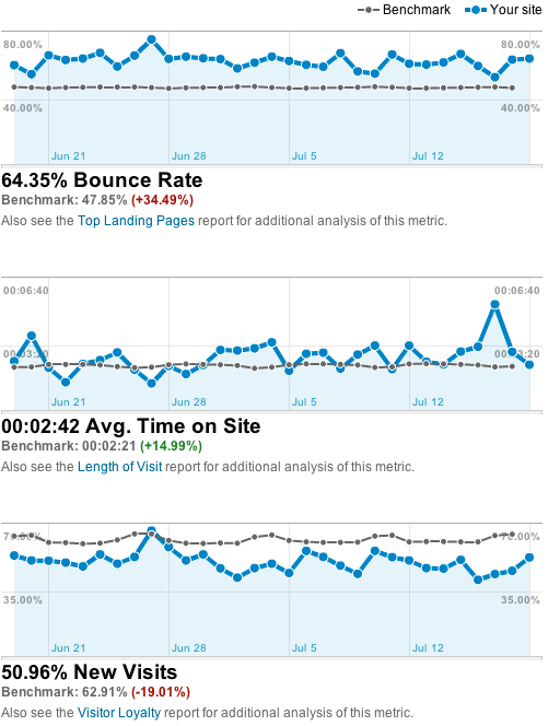 This has a typical bounce rate for a blog : 60-80%, since many visitors are referred from search or Twitter, check out the article and then disappear. We also have a lowish average time on site although new visitors often go onto browse the About Us or top nav giving our advice on other topics. Check out our post on using the Dimensionator to understand the popularity of the second page viewed - important for engaging visitors.