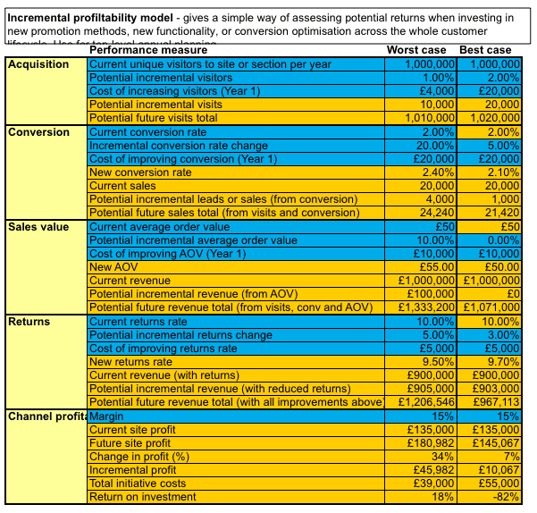 Going to a greater level of accuracy/complexity, I developed this conversion rate calculator to help companies see the potential improvements possible across all of Internet marketing including improvements to acquisition and reduction in returns. It also includes the costs of conversion rate optimisation projects.