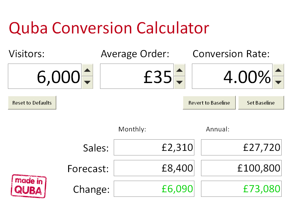 This calculator from David Sealey at Quba takes a conversion model right down to basics, so it's great as a starting point for small businesses, but remember that conversion rates for Ecommerce vary dramatically by new or repeat customers, by channel and of course by product category.