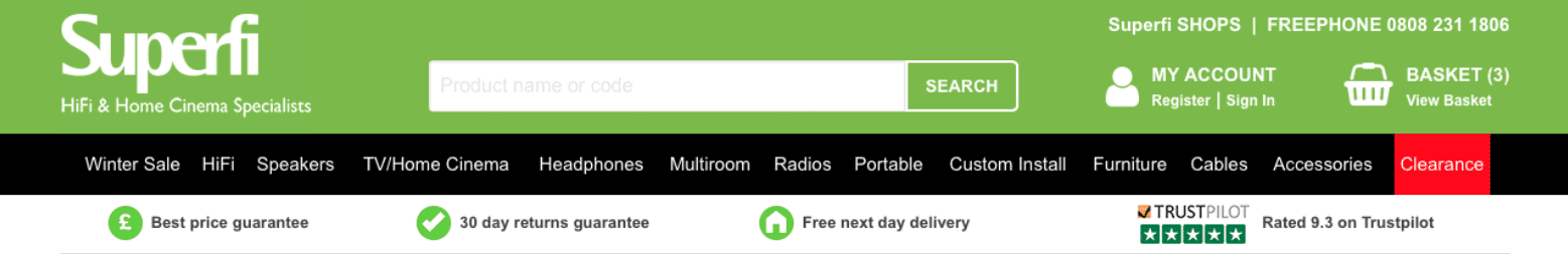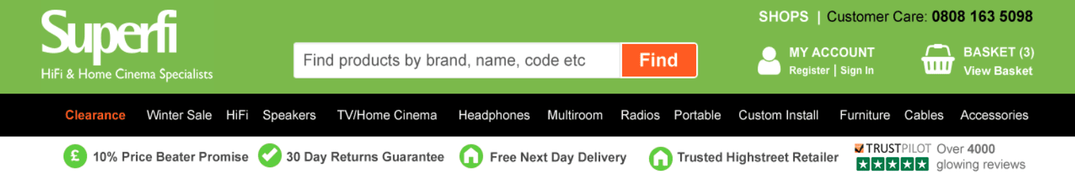 Variation: The test variant tipped the balance in order to give more prominence to elements more important to conversion. Popular links opened in adjacent tabs rather than new ones, allowing the user to keep their current place in the sales funnel. Trust Pilot now mentioned ‘over 4000 glowing reviews’ instead of a rating less than 10/10 with the aim of eliminating doubt. The all important clearance link was moved to the far left of the navigation and the search bar was given a more striking call to action button and strong, intuitive placeholder text.