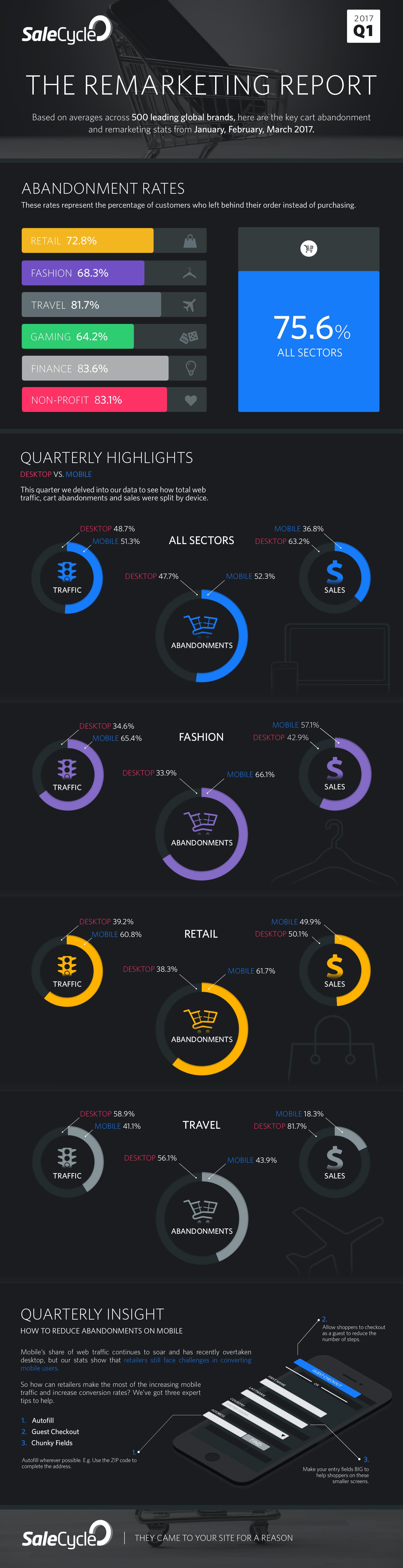The global cart abandonment rate for Q1 2017 was 75.6%, down 1.2% from the previous quarter, which included the Christmas shopping season.