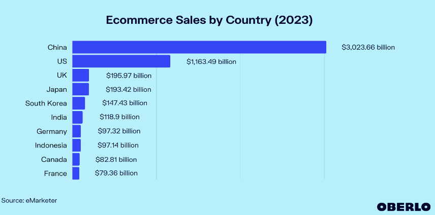The chart below from Oberlo's 2023 e-commerce breakdown by country predicts a global e-commerce sales growth of 8.9%. Using analysis by eMarketer, the report predicts the highest growth in the Philipines, India and Indonesia (all growing over 20% YOY).