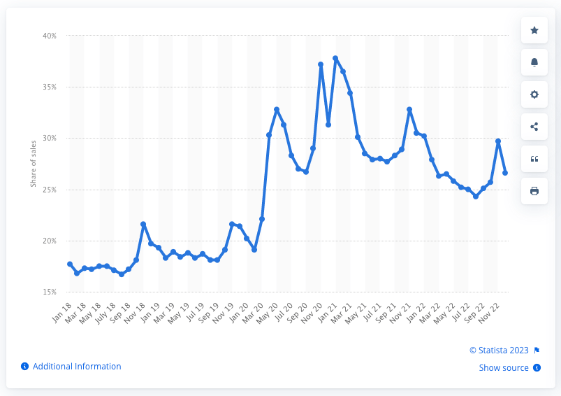 Equally, we have watched the overall percentage of e-commerce retail sales in the UK rising to over a third of all retail in the UK in November 2020 and January 2021. It has since decreased slightly, as of December 2022, amounting to just over a quarter.