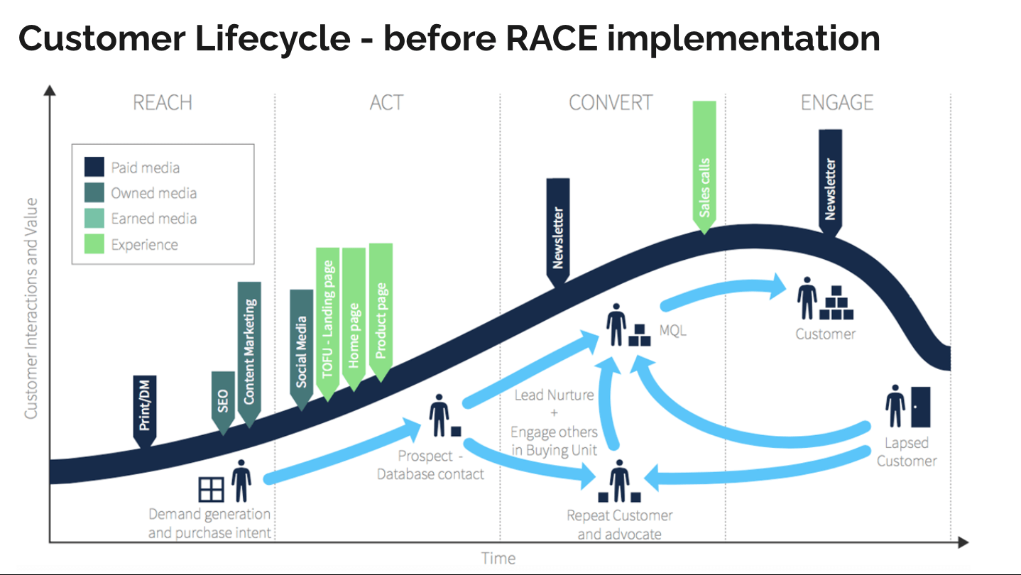 You can see in this example of a typical customer lifecycle before and after RACE implementation. Here - reach, act, and convert are all key steps to acquisition, while post-purchase engagement fuels retention and loyalty.