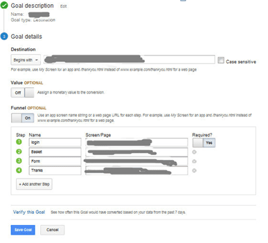 Initially, you need to set up the goal (e.g. based on the Destination URL) and arrange the funnel steps.