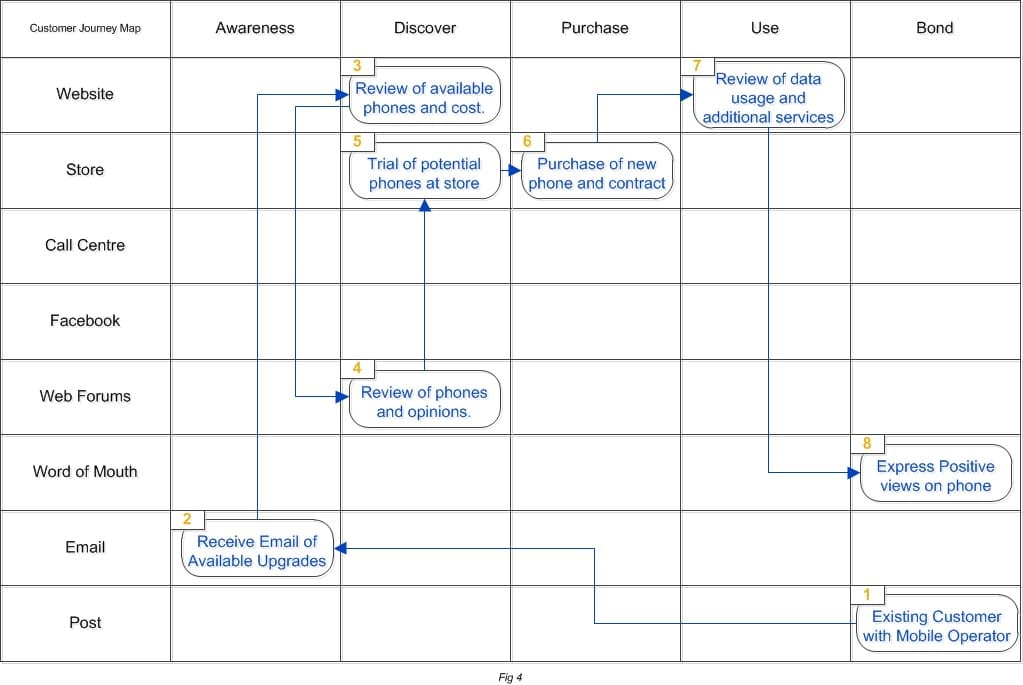 In the first instance use your own frame of reference to plot your journey when making that initial purchase with your business. For example in Fig 4 I have plotted a recent journey I completed when choosing a new mobile phone: