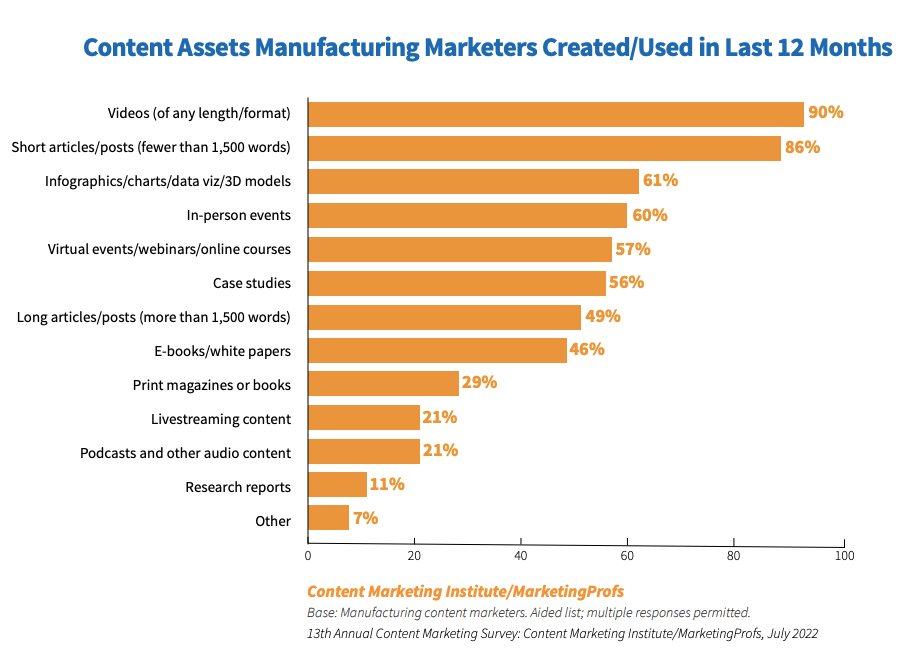 Once you've got your customer onto your webpage, now is time to delight them with content that will keep them interacting with you. Content Marketing Institute reported in their manufacturing content marketing 2023 insights that last year manufacturing marketers used videos, short articles, and infographics as their top 3 content types.