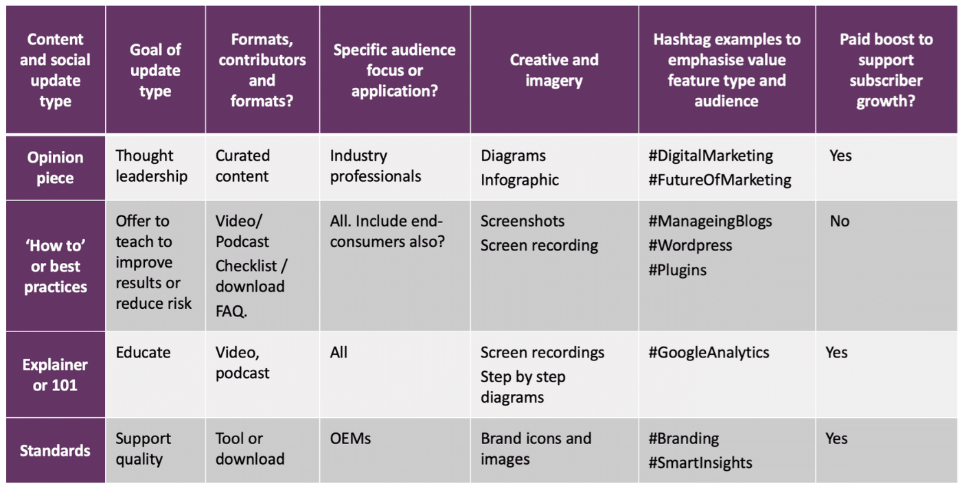 Smart Insights members are utilizing our content marketing tools and templates, such as the blog editorial planner in our Content Marketing Learning Path. Here you can see the 4 different types of blogs that could be planned to support increasing subscribers to your manufacturing business.