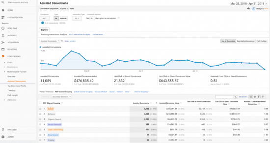Just to boggle your mind (a little bit) the Multi-Channel Funnels report is running on a different reporting API than the Acquisition reports that we just talked about. The key difference is how they treat Direct traffic. In the acquisition channels report, it is the last Non-Direct channel to get 100% of the credit, comparatively, in the Multi-Channel Funnel reports - it works on Last Click, so if Direct was the last touchpoint then Direct would get 100% of the credit.