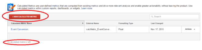 This will bring you to the Custom Metrics interface. Note that it will display any existing metrics set up on this view and give you a countdown (bottom left) of how many you have left. Click on the red button +New Calculated Metric