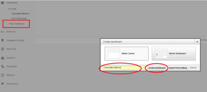 If you don’t have a dashboard click + New Dashboard , give it a name eg Calculated Metrics , select Create Dashboard.