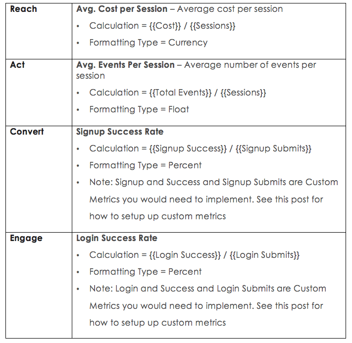 Note: Signup and Success and Signup Submits are Custom Metrics you would need to implement. See this post for how to setup up custom metrics