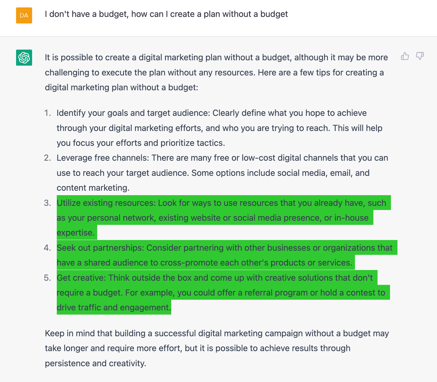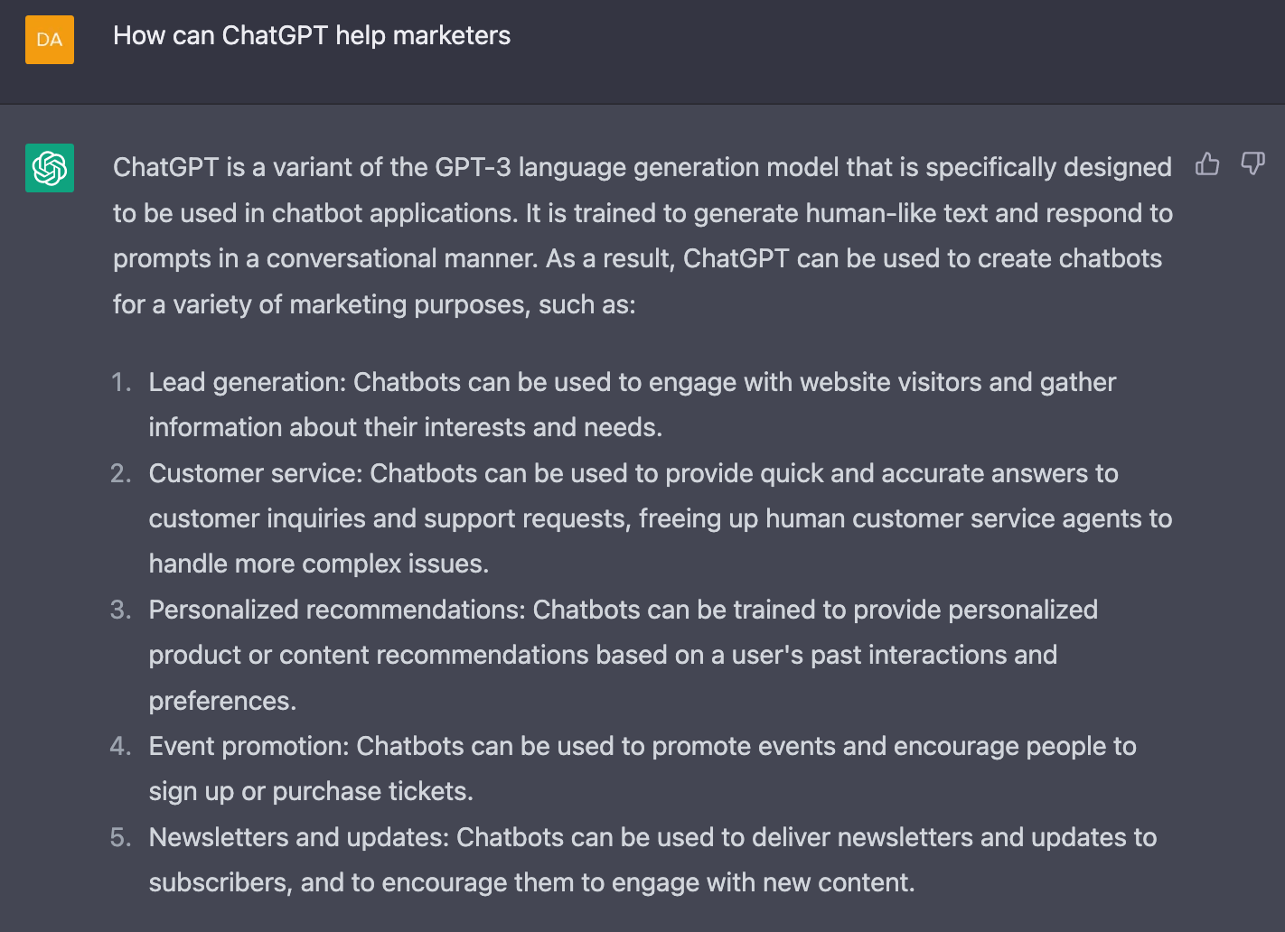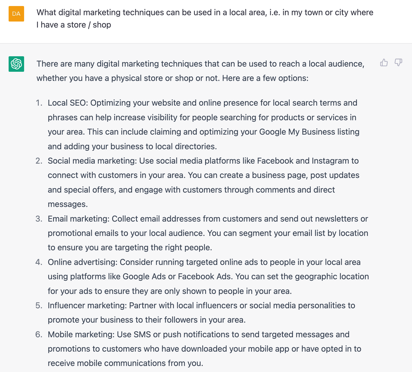 You'll see from my examples that you type in a question and it responds with an answer, remembering the context from previous questions. For more channel specific marketing tips, you can read more about my top 8 recommended prompts for using ChatGPT for digital marketing.