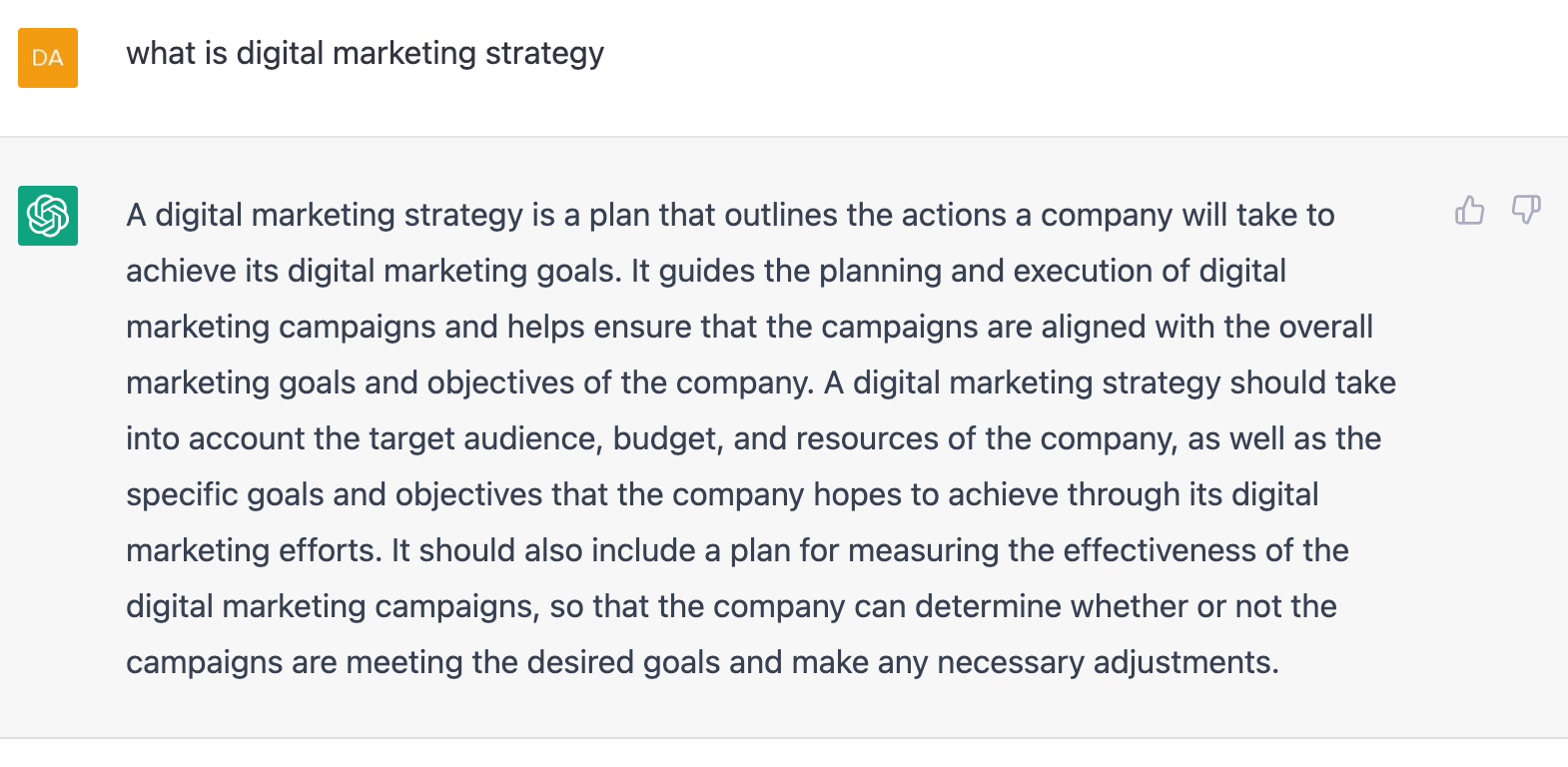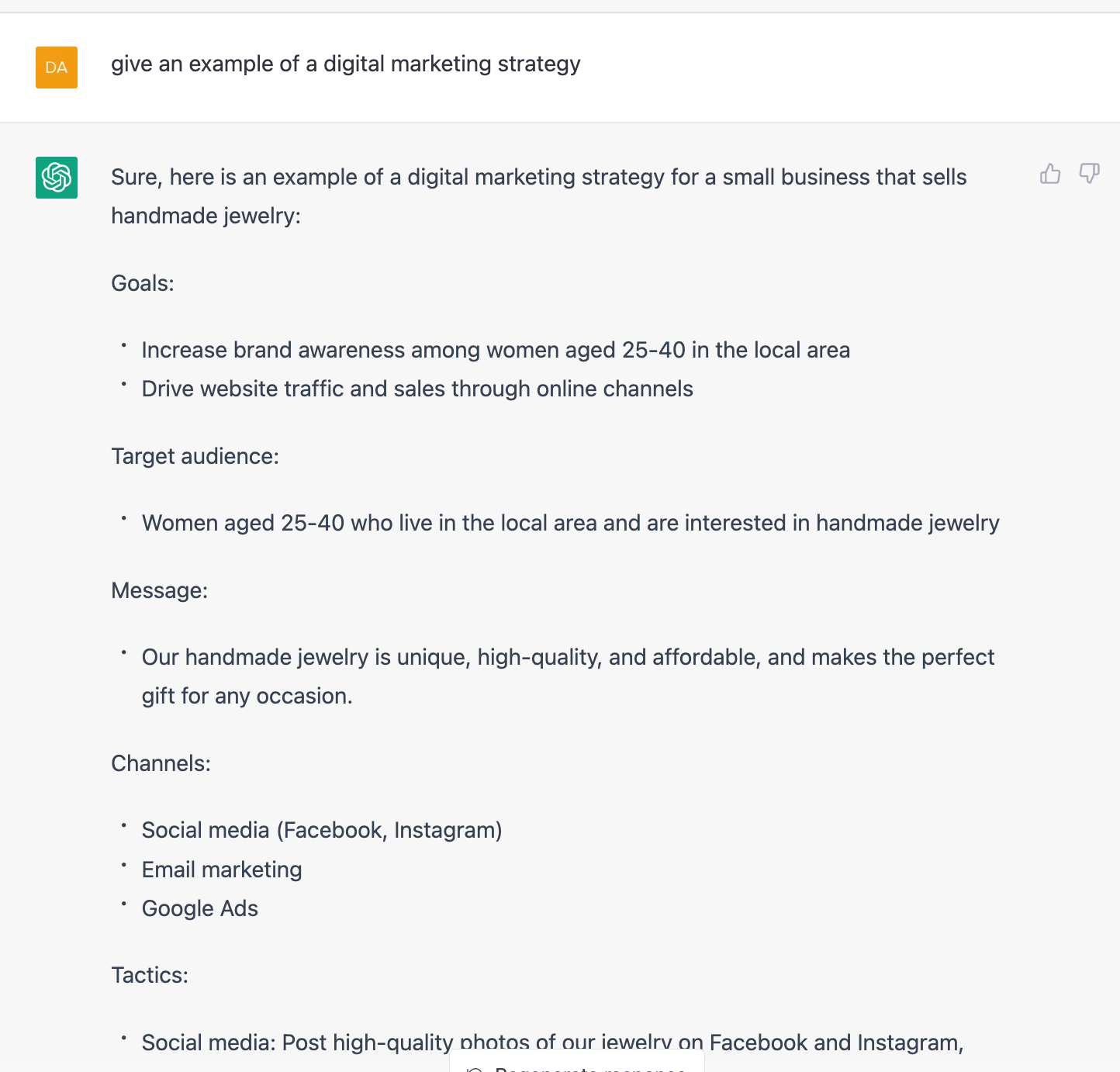 We’ve also found that examples are really useful for explaining how to create digital marketing strategies. We provide many examples for different industries in our templates. How does ChatGPT do here?