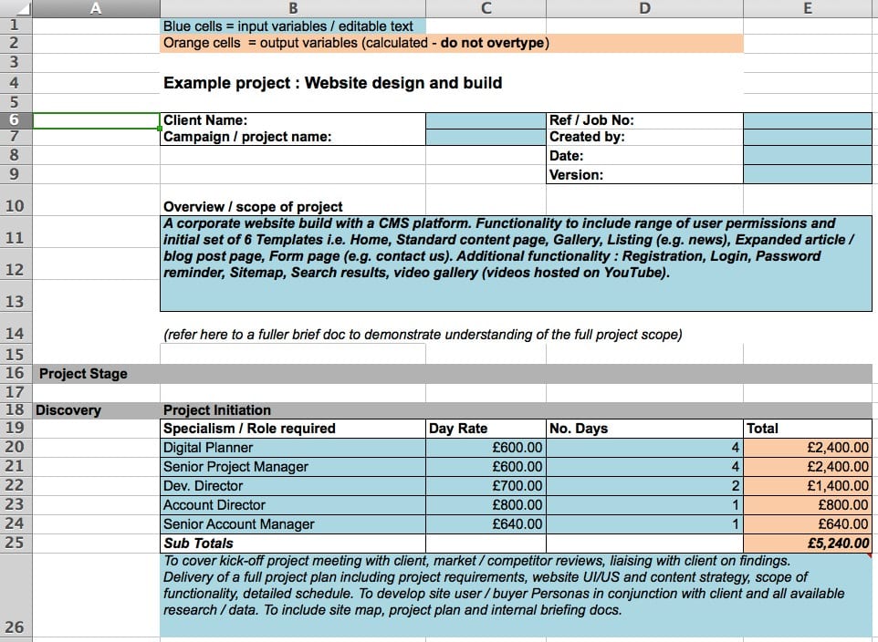 A blended rate covers all the specialists in the agency, regardless of role or seniority and will be one rate (e.g £650 per day). Useful if you are trying to keep things simple whilst estimating. And some clients will prefer this approach. Clients may ask you to give specific individual rates though if they are trying to compare ‘apples with apples’ in a pitch situation.