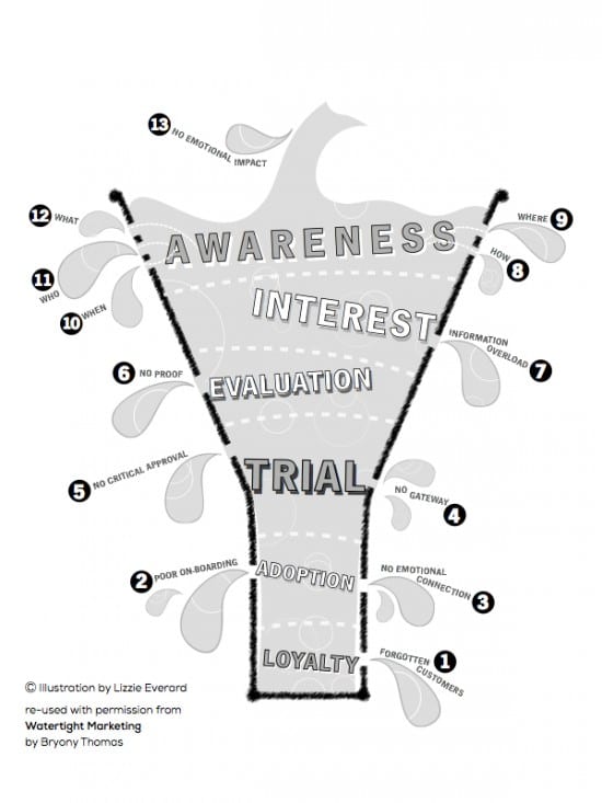 The book gets off to a really useful start with Bryony’s review of the marketing funnel. We all know the funnel concept of course, but by reviewing 13 of the most common touchpoint leaks as shown below she gives a great, actionable checklist to help businesses review and improve their communications strategy.