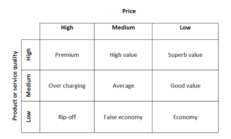 You can use the Price - Quality Strategy Model to review competitors’ products and services and review their strategies. Why do they charge more? Why do they charge less? Sometimes if aspects of a service are removed, this can contribute to lower prices.