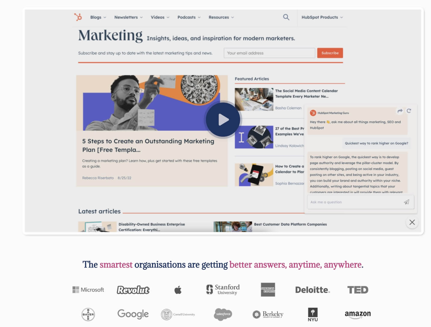 Another approach relating to the Fine-tuning I mentioned earlier is exemplified by MyAsk AI is to use a standalone AI knowledgebase to which you can upload company documents to answer customer queries using a GPT engine. HubSpot is using this on there site.