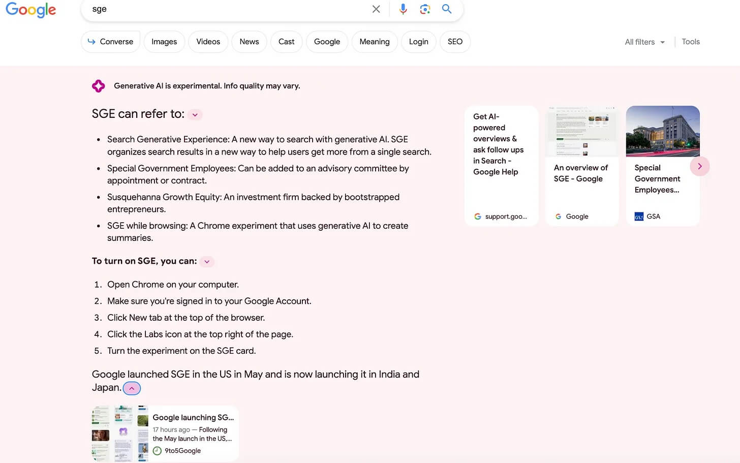 We can also expect that the release of Google’s new Search Generated Experience (SGE) will dramatically increase use of Generative AI when it goes live, which is expected to happen in 2024. This will give Google users an AI conversational response like Bing AI. It’s currently being tested in the US, India and Japan and although Google is testing many changes to balance usability and monetization through Ads, it seems likely it will launch in 2024. Some SEOs such as Eli Schwartz are forecasting an SEO apocalypse as clickthroughs to sites decline as the AI in the SERP answers the user's query.