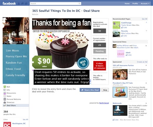 North Social has a suite of apps, they refer to as their ‘app buffet’ which includes deal sharing. When someone interacts with the deal share app, they are presented with information on the page as to how many registrations are required to activate the deal, it’s status, registration limit and the time left before the deal becomes inactive. To register for the deal, the user must share it with their friends and register their name and e-mail through a sign-up form.