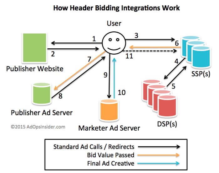 Header bidding involves the website media owner or publisher placing a line of JavaScript in the website’s header. When a page on the site is loaded, the code reaches out to the supported ad exchanges or supply-side platforms (SSPs) for bids before its own ad server is called. Bidding is essentially simultaneous, instead of sequential, and focuses on all available impressions, not just the ones available after direct sales.