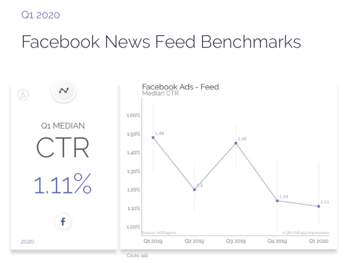 Again, we will use the Q1 2020 ad benchmark report from AdStage as our primary data source. Here are the media CTRs for their clients in North America: