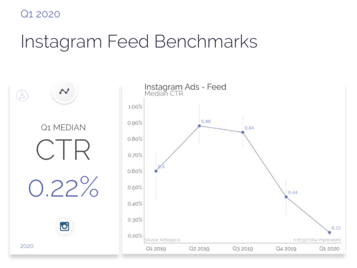 Instagram ad clickthrough rate in the feed is 0.22%, significantly lower than in the previous year and much lower compared to Facebook. This reflects the visual nature of Insta which doesn't offer opportunities for CTR in organic newsfeeds (other than Stories). Benchmarks for Stories are a little higher at 0.33%.