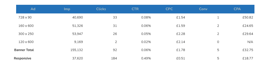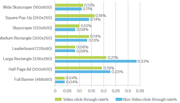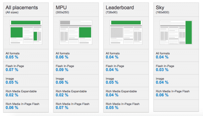 Previous pre-2015 Doubleclick data shows an average CTR of just 0.05% for all display formats, i.e just 5 clicks per 10000 impressions, showing the difficulty of driving direct response from online display or banner ads. Perhaps that is why Google no longer publishes this data...