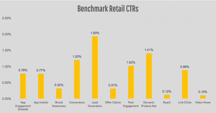 Facebook offers different forms of ad formats with different goals will naturally vary in response as these retail Facebook ads from. You can see that Facebook ad CTRs which may be more highly targeted that display ads have significantly higher CTRs, particularly for Lead generation (i.e. adding subscribers to a retailers email list) and Dynamic Product ads (retargeting visitors who have already visited a site with relevant offers).