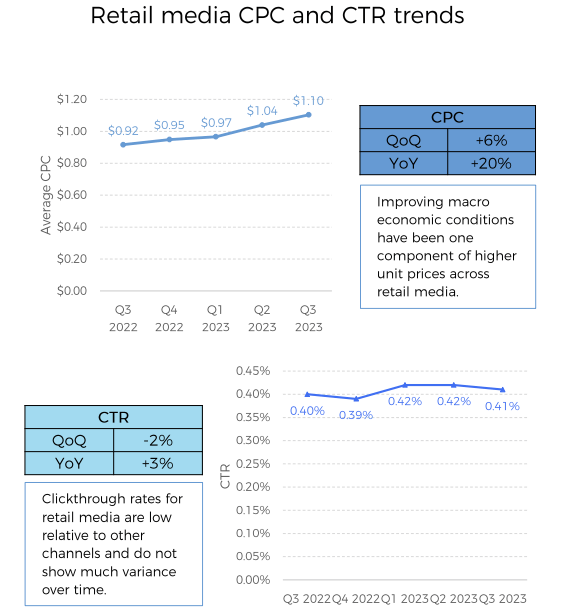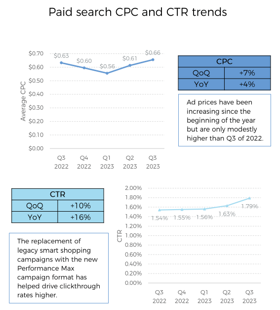 Brands using it include Pepsico, Diageo, Reckitt, Daimler, LG, and Vodafone. It is one of the few sources available offering CTR benchmarks for search and display. Trends in retail categories are also shown in the full report. The most recent version published as of Jan 2024 includes Q3 of 2023, these are shared below.