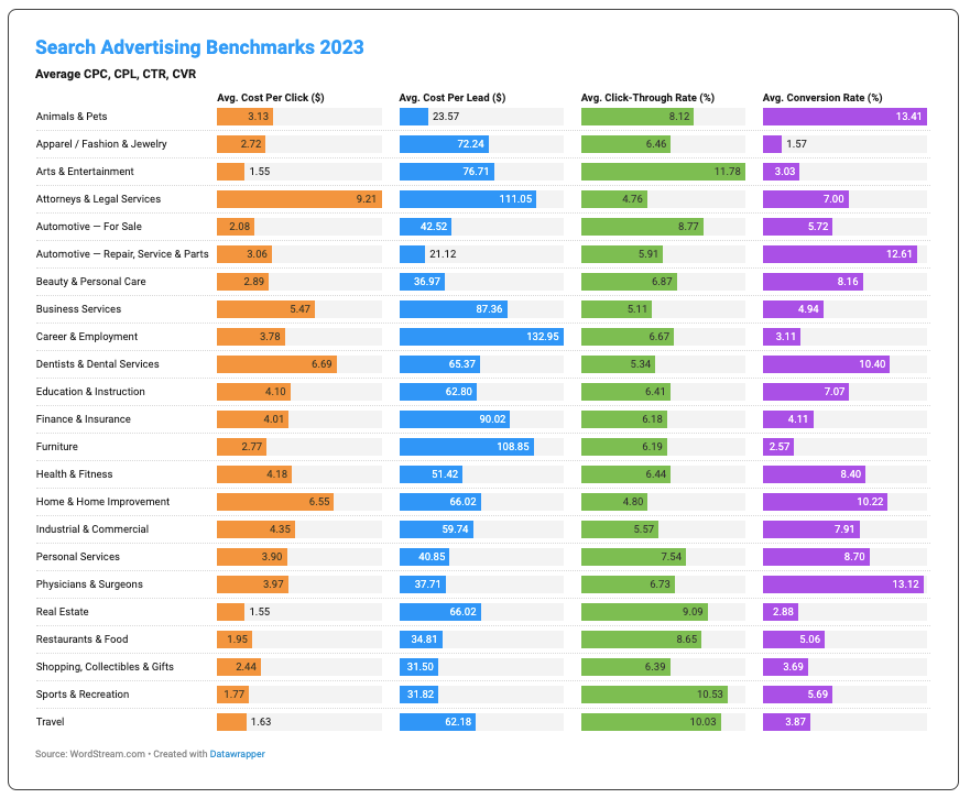 One of the best sources for PPC data is LocalIQ/Wordstream paid search bencmarks. Note that the sample is typically for smaller local businesses. The data below details CTR, CPC, CR and CPL in 2023 for a wide range of business categories:
